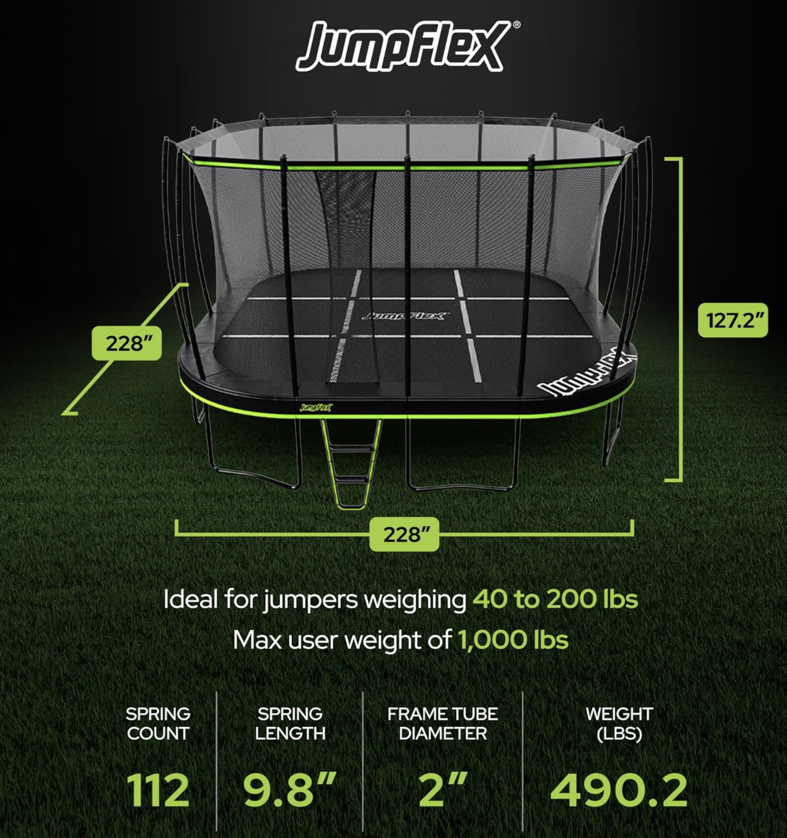 • Features: Massive 10×16’ jump area, 1,100 lb weight limit, premium enclosure, ultra-thick frame, ladder included
